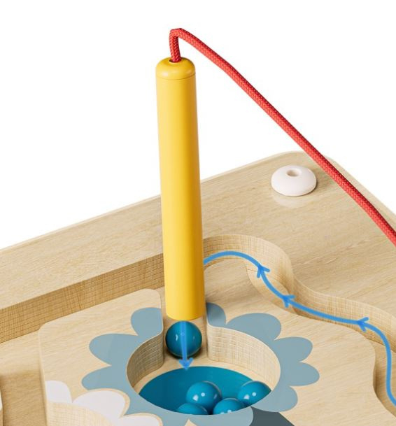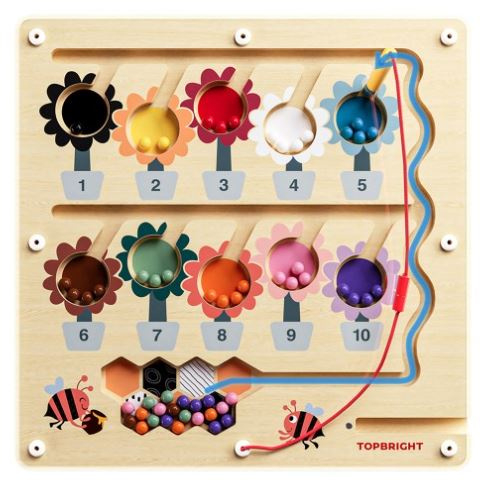 - Met behulp van een kindvriendelijke magnetische pen manoeuvreren de kleintjes kleurrijke kralen door het doolhof, overwinnen ze obstakels en sorteren ze de kralen op kleur en nummer.