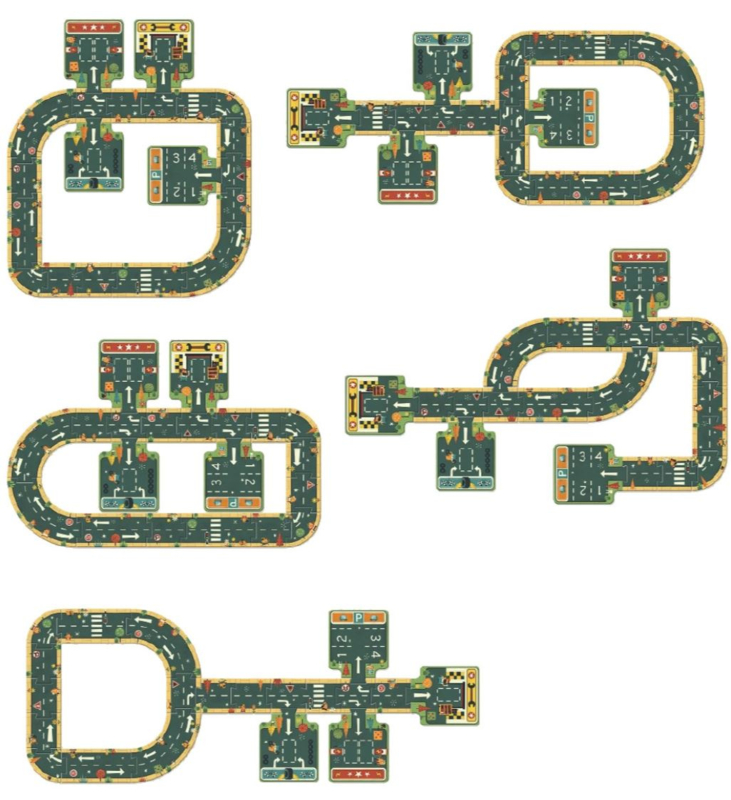 Deze autobaan bestaat uit 21 puzzelstukken van sterk karton, die op talloze manieren in elkaar te zetten zijn, zodat je je eigen pad kan creëren.