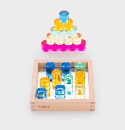 De set bevat 25 doorschijnende acryl cirkels in 5 kleuren, gepresenteerd in een beukenhouten dienblad met spiegelende bodem. De spiegel versterkt het licht en zorgt voor magische reflecties en kleurspel. De cirkels hebben gladde randen, liggen prettig in de hand en maken een zachte, aangename klank wanneer ze rollen of tegen elkaar tikken.